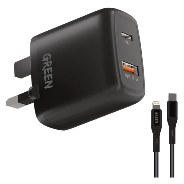 Green Lion Dual USB Port Wall Charger PD+QC3.0 20W UK with PVC Type-C to Lightning Cable 1.2 M – GNC20WUCLBK